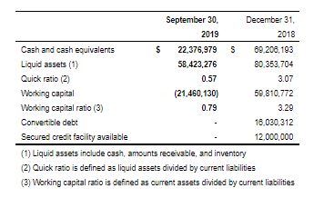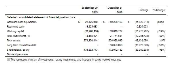 The following is a summary of key balance sheet items as at September 30, 2019, compared to December 31, 2018: