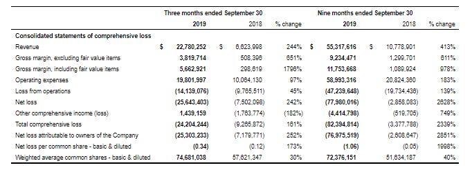 The following tables set forth consolidated statements of financial information for the three and nine-month periods ended September 30, 2019 and September 30, 2018. For further information regarding the Company’s financial results for these periods, please refer to the Company’s Management’s Discussion and Analysis for the periods ended September 30, 2019 and September 30, 2018 and the Company’s Financial Statements for the periods ended September 30, 2019, which will be published on Origin House’s issuer profile on SEDAR at www.sedar.com and the Company’s website at www.originhouse.com, by November 29, 2019.