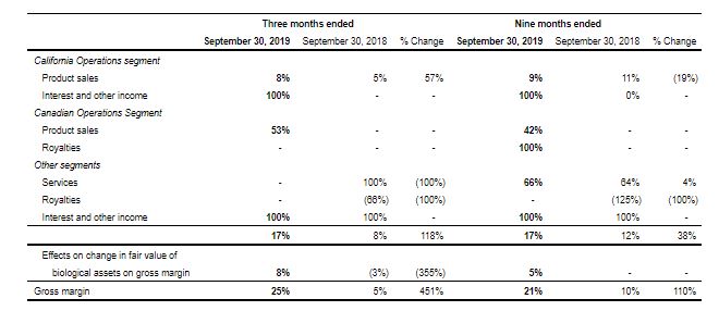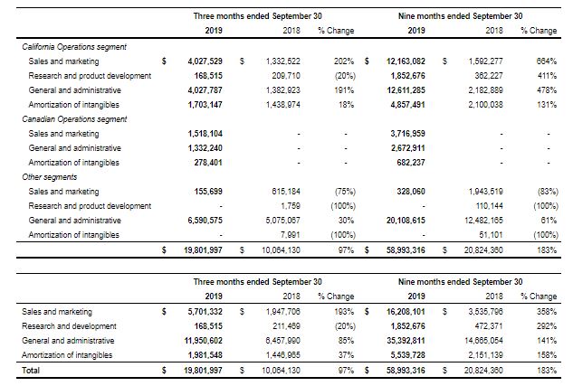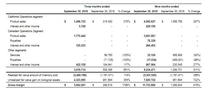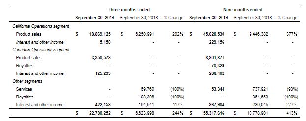 I am very proud of our team’s performance during the first nine months of 2019, with revenue of $55.3 million up more than five-fold from the same period last year. Our growth during Q3 speaks to the strength of the organization, given the dedication of substantial resources to the Cresco Labs arrangement transaction and headwinds from the vape crisis, which impacted both our California and Canadian operations.