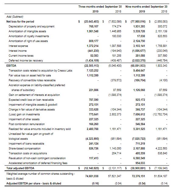 OTTAWA, Nov. 27, 2019 /CNW/ – CannaRoyalty Corp. d/b/a Origin House (CSE: OH) (OTCQX: ORHOF) (“Origin House” or the “Company”), a North American cannabis products and brands company today announced its financial results for the three and nine-month periods ended September 30, 2019. All figures are reported in Canadian dollars ($), unless otherwise indicated. Origin House’s financial statements are prepared in accordance with International Financial Reporting Standards (“IFRS”).