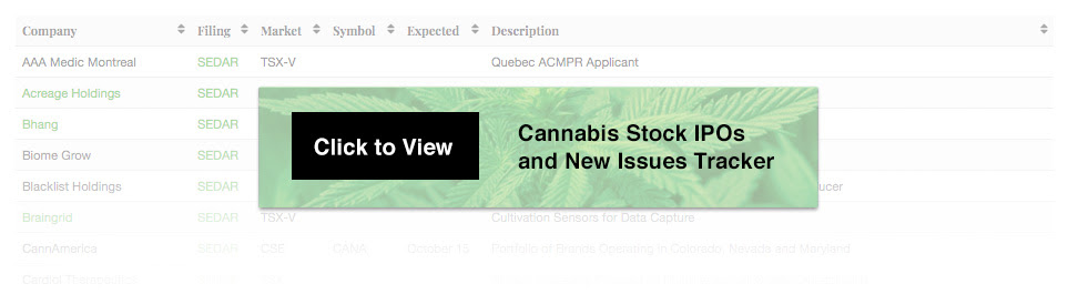 The Cannabis Stock IPO and New Issues Tracker, managed by New Cannabis Ventures, tracks upcoming initial public offerings of cannabis companies within the United States, Canada and other countries. The tracker also provides data on upcoming RTOs (Reverse Takeovers). Companies must file with the SEC, SEDAR or their regulatory authority to be considered for inclusion.