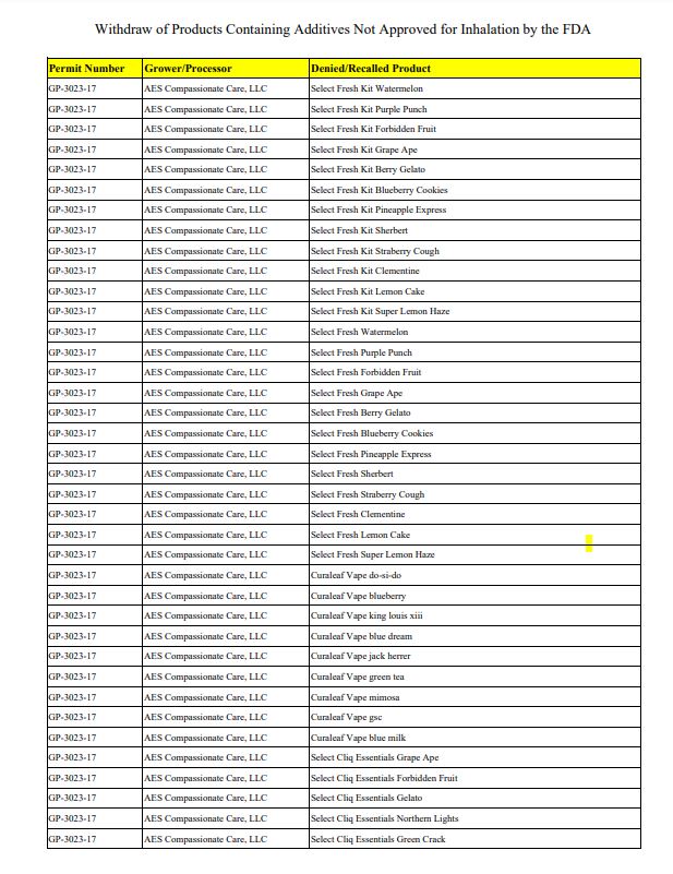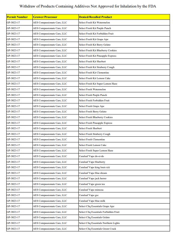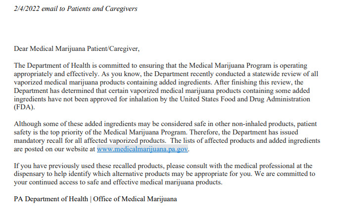 The Pennsylvania Department of Health sent an email to medical cannabis patients in the state today announcing a mandatory recall of hundreds of different vape cartridges: