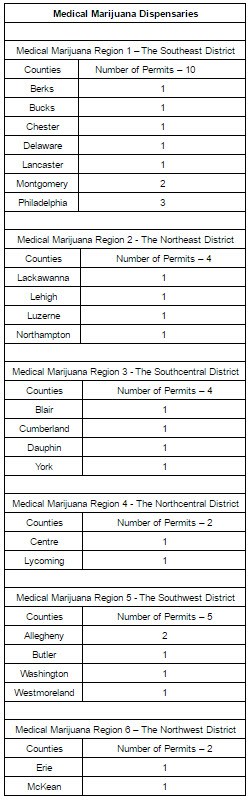 The following tables represent the number and counties for medical marijuana primary dispensary permits.