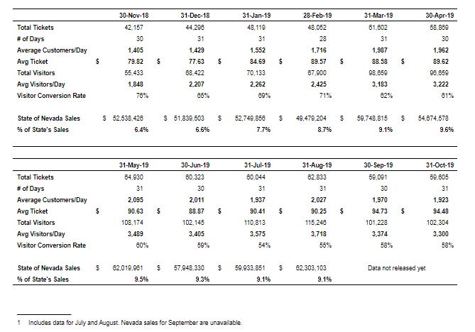 ³https://tax.nv.gov/uploadedFiles/taxnvgov/Content/TaxLibrary/NV-Marijuana-Revenue-FY20%20(003)(1).pdf from January 1, 2019 to August 31, 2019. Nevada sales for September are unavailable.