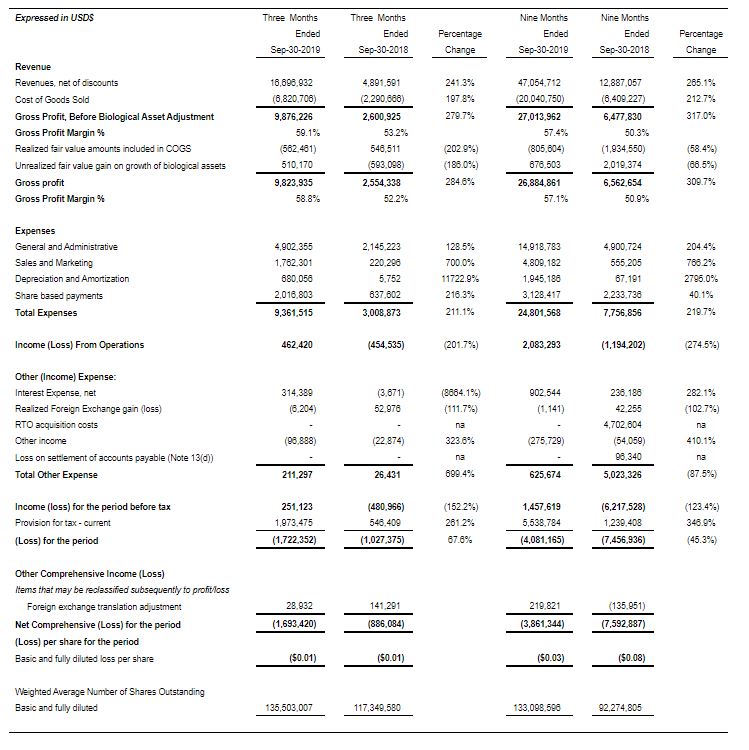 - Gross profit before biological adjustments was $9.9 million or 59.1% as compared $2.6 million or 53.2%, an increase of 280%