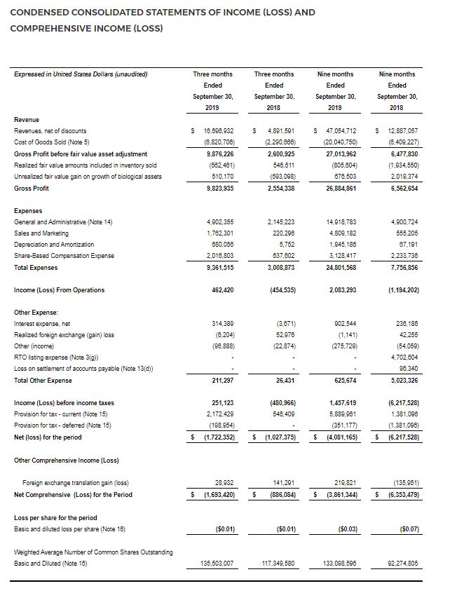 The following tables set forth consolidated statements of financial information for the three-month and nine-month period ending September 30, 2019 and September 30, 2018. For further information regarding the Company’s financial results for these periods, please refer to the Company’s interim financial statements for the period ended September 30, 2019 together with the MD&A, available on Planet 13’s issuer profile on SEDAR at www.sedar.com and the Company’s website https://www.planet13holdings.com.