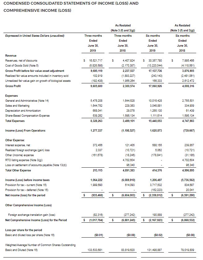 The following tables set forth consolidated statements of financial information for the three-month and six-month period ending June 30, 2019 and June 30, 2018. For further information regarding the Company’s financial results for these periods, please refer to the Company’s interim financial statements for the period ended June 30, 2019 together with the MD&A, available on Planet 13’s issuer profile on SEDAR at www.sedar.com and the Company’s website https://www.planet13holdings.com.