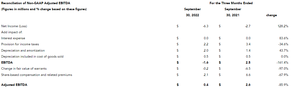 There are financial measures included in this press release that are not in accordance with GAAP and therefore may not be comparable to similarly titled measures and metrics presented by other publicly traded companies. These non-GAAP financial measures should be considered as supplemental to, and not a substitute for, our reported financial results prepared in accordance with GAAP. The Company includes EBITDA and Adjusted EBITDA because it believes certain investors use these measures and metrics as a means of assessing financial performance. EBITDA is calculated as net income (loss) before interest, taxes, depreciation and amortization and Adjusted EBITDA is calculated as EBITDA before share-based compensation, the change in fair value of warrants and one-time non-recurring expenses.