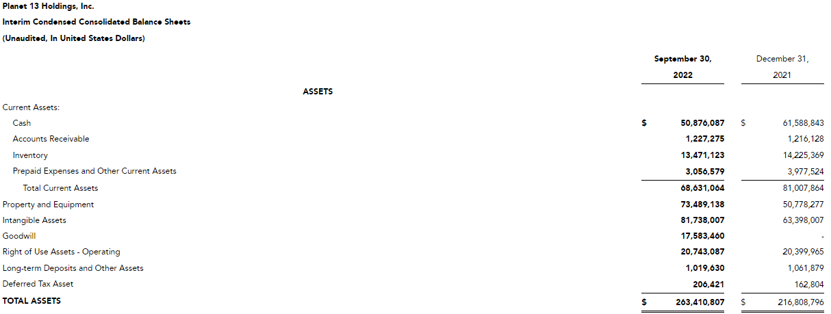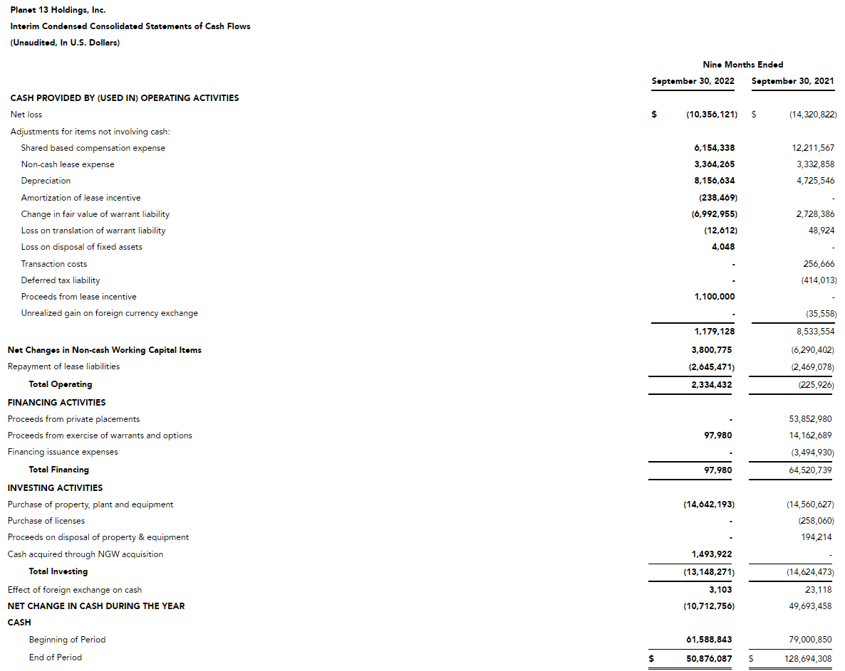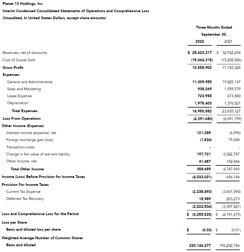 LAS VEGAS, NV / ACCESSWIRE / November 10, 2022 / Planet 13 Holdings Inc. (CSE:PLTH)(OTCQX:PLNHF) (“Planet 13” or the “Company”), a leading vertically-integrated cannabis company, today announced its financial results for the three-month and nine-month period ended September 30, 2022. Planet 13’s financial statements are prepared in accordance with U.S. Generally Accepted Accounting Principles (“GAAP”).