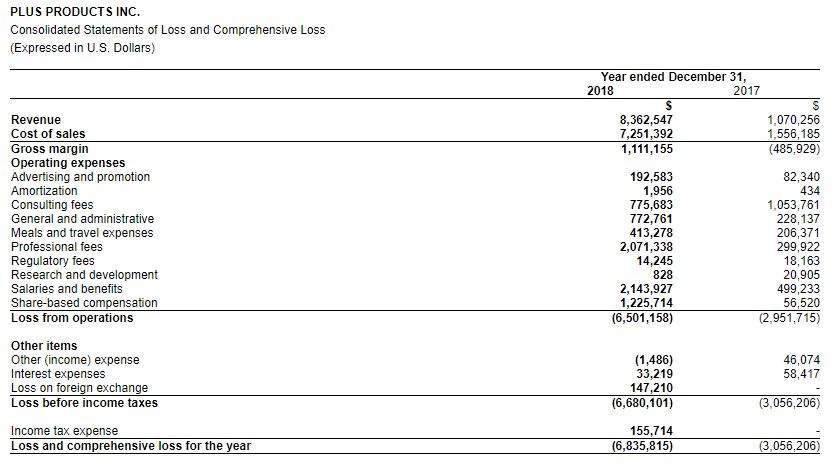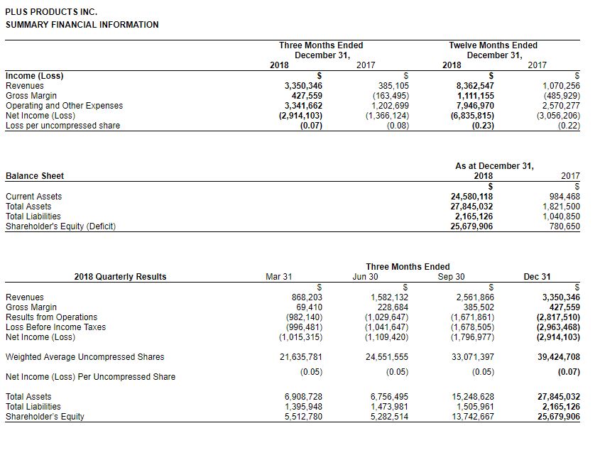Plus Products Reports Audited 2018 4th Quarter and Year-End Financial Results