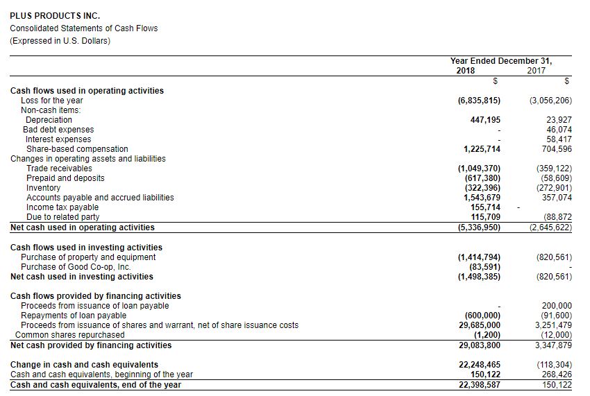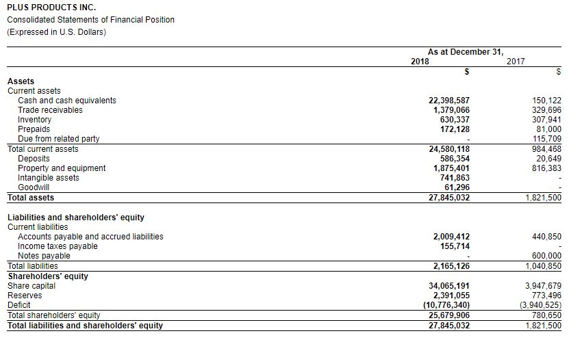 The highlighted financial information should be read in connection with the summary financial information at the end of this press release together with the Company’s audited annual financials along with the MD&A (Management Discussion & Analysis) filed on www.sedar.com under the Plus Products Inc. profile.