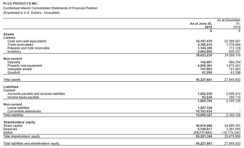Plus Products Reports Unaudited 2019 Second Quarter Results