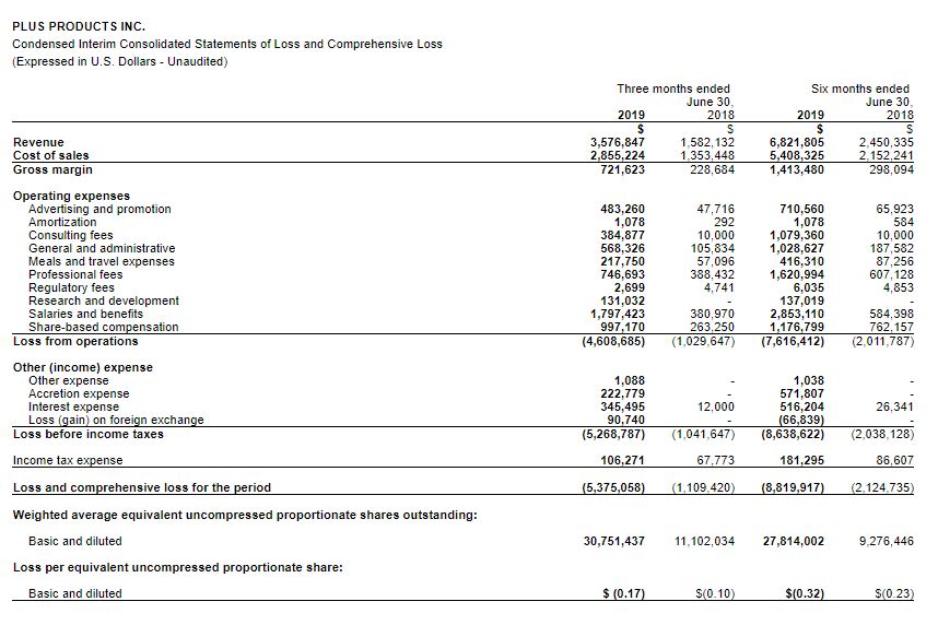 SAN MATEO, Calif., Aug. 30, 2019 (GLOBE NEWSWIRE) — Plus Products Inc. (CSE: PLUS) (OTCQB: PLPRF) (the “Company” or “PLUS”), a leading cannabis branded products company in the U.S., today released its unaudited financial and operational results for the three and six months ended June 30, 2019, expressed in U.S. Dollars. These filings are available for review on the Company’s SEDAR profile at www.sedar.com and with the Canadian Securities Exchange (the “CSE”).