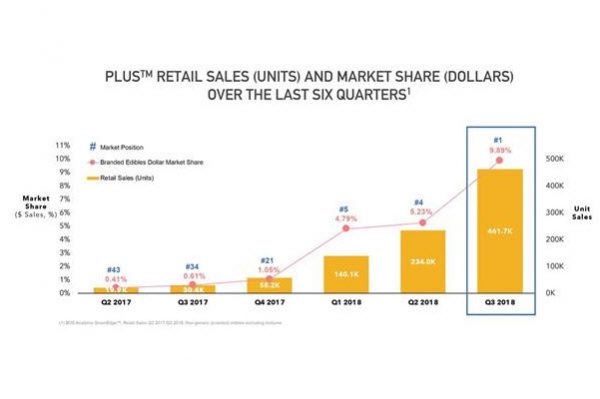 According to BDS Analytics, PLUS unit sales have grown 97% from Q2 2018 to Q3 2018, improving its edibles market position from #4 to #1 in retail value of sales.