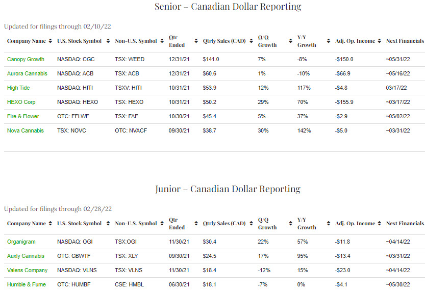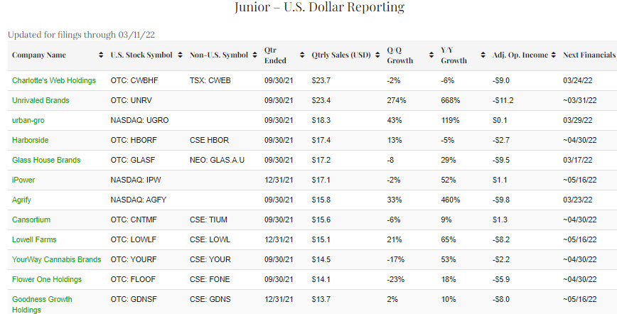 Due to the rapid growth in the cannabis industry, we raised the minimum to US$25 million (C$32 million) to qualify for what we now call the senior list and introduced a junior list with a minimum of US$12.5 million (C$16.0 million) in September 2021. At the time of our last update in late February, 36 companies qualified for inclusion on the senior list, including 30 filing in U.S. dollars and 6 in the Canadian currency. The junior list now includes 12 reporting in U.S. dollars and 4 in Canadian dollars. On a combined basis, the Public Cannabis Company Revenue & Income Tracker now includes 52 companies. Since our last update, Cronos Group (TSX: CRON) (NASDAQ: CRON) has moved from the junior group to the senior group of companies reporting in American dollars. We have also removed GAGE Growth from the U.S. senior group, which now includes 30 companies, due to its acquisition. We expect to add additional companies in the months ahead, and, due to pending or recently completed mergers, we anticipate some removals as well. We note that Intercure (TASE: INCR) (NASDAQ: INCR), which reports in the Israeli currency, qualifies for the junior list, but we haven’t yet added it due to its different reporting currency.