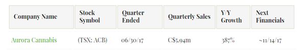 Thirteen companies currently qualify for inclusion, with five based in the United States and eight in Canada. On September 26th, we updated the list to reflect the FY17-Q4 financials released by Aurora Cannabis (TSX: ACB) (OTC: ACBFF). The company’s quarterly sales of C$5.94mm moved it into third-place among the Canadian companies and represented growth of 387% over the same quarter a year ago.