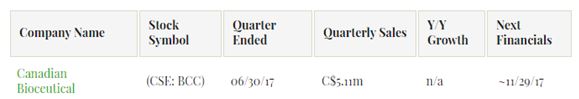 Thirteen companies currently qualify for inclusion, with five based in the United States and eight in Canada. On September 28th, we updated the list to reflect the FY18-Q1 financials released by Canadian Bioceutical (CSE: BCC) (OTC: CBICF). The company’s quarterly sales of C$5.11mm moved it into fifth-place among the Canadian companies. Its sales, which are entirely from its Arizona operations, grew 14% over FY17-Q4.