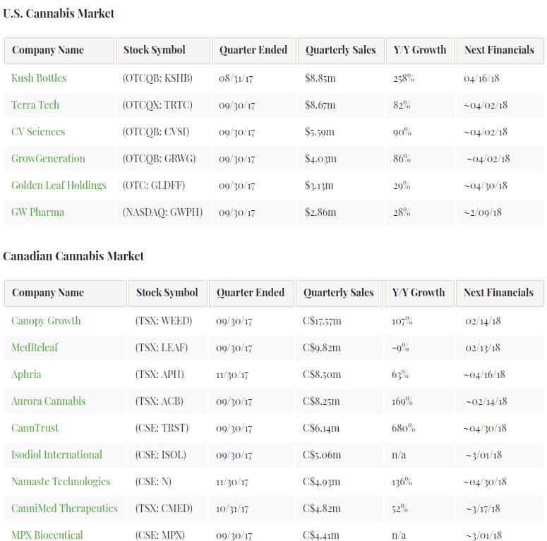 Fifteen companies currently qualify for inclusion, with six filing in U.S dollars and nine in the Canadian currency. In the United States,Kush Bottles (OTC: KSHB) reported FY18-Q1 (the quarter ending 11/30/17) sales of $8.85 million, which represented growth of 258%. We have updated the Canadian list to reflect the recent results from CanniMed Therapeutics (TSX: CMED) (OTC: CMMDF), which reported sales of C$4.82 million for its FY17-Q4 ending 10/31/17, a 52% increase over the same quarter a year ago, and Namaste Technologies (CSE: N) (OTC: NXTTF), which reported sales of C$4.93 million for its FY18-Q1 ending 11/30/17), a 136% increase from the same quarter a year ago.