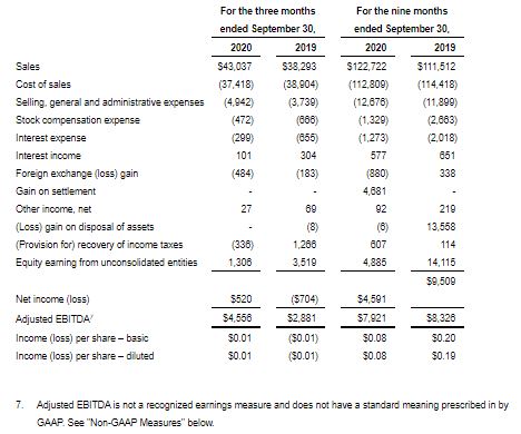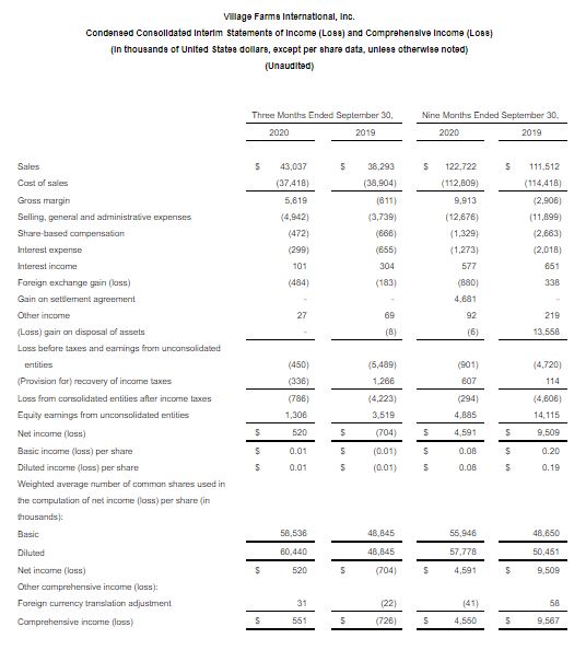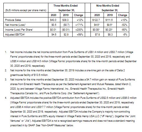 VANCOUVER, BC, Nov. 13, 2020 /PRNewswire/ – Village Farms International, Inc. (“Village Farms” or the “Company”) (NASDAQ: VFF) (TSX: VFF) today announced its financial results for the three and nine months ended September 30, 2020. All figures are in U.S. dollars unless otherwise indicated.