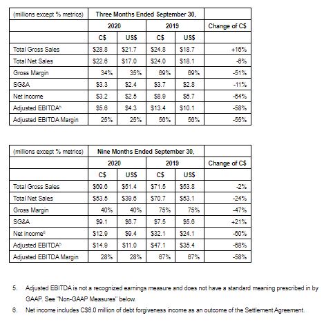 Pure Sunfarms’ Financial Summary for the Three and Nine Months Ended September 30, 2020 (Before Village Farms’ Proportionate Share)