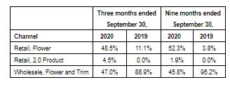 The channel makeup of the third quarter sales was 53% to the retail channel and 47% to the wholesale channel. The channel makeup of the second quarter sales was 69% to the retail channel and 31% to the wholesale channel. Cannabis 2.0 derivative products were 4.5% of third quarter sales, which are included in the retail channel.