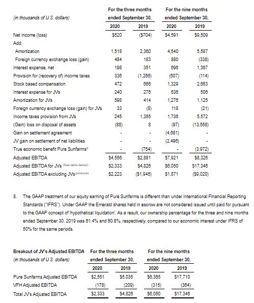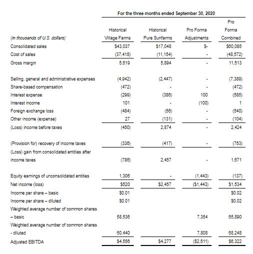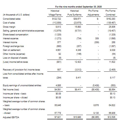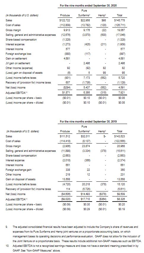 The Company’s financial statements for the three and nine months ended September 30, 2020, as well as the comparative periods for 2019, have been prepared and presented under United States Generally Accepted Accounting Principals (“GAAP”). On September 30, 2020, Village Farms had a majority (non-controlling) interest of 58.7% of Pure Sunfarms Corp. (“Pure Sunfarms”), as the full acquisition of the remaining interest in Pure Sunfarms did not occur till November 2, 2020. Accordingly, Pure Sunfarms results are not consolidated for the third quarter.