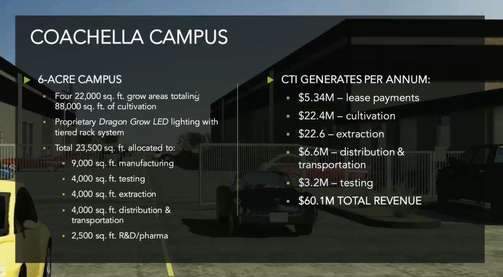 The first major project for the company is in Coachella, California which will span 111,500 square feet including (4) cultivation centers, (2) manufacturing facilities, a testing lab, a distributor and transportation hub, and a pharmaceutical office. The company expects to replicate this in other municipalities in California.