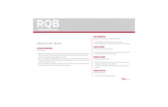 Bill Robinson (no relation) will lead the Company’s efforts in Government/Indigenous Relations and Strategic Partnerships. In this newly created and important role, Mr. Robinson’s mandate will be to identify, cultivate and deepen trusting relationships with Federal and Provincial government bodies – Indigenous Peoples or otherwise – as well as to foster mutually beneficial partnerships with select Indigenous Peoples across Canada, specific to the legal production and sale of cannabis.