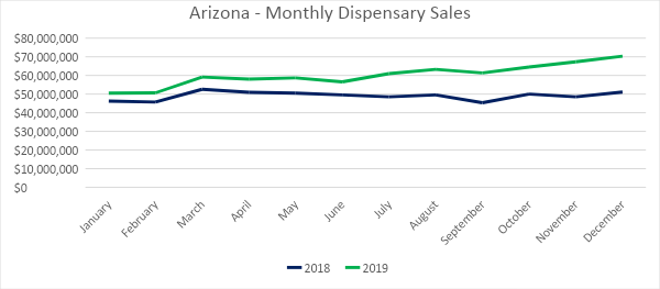 Sales for Arizona’s medical dispensaries were $70.3 million this past December, a four percent increase from November. Compared to December 2018, sales increased nearly 38 percent. Total sales for calendar year 2019 were $721.4 million, a $132.8 million increase from 2018.