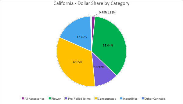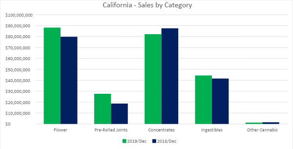 In December, Flower contributed over 35 percent towards overall revenues with $88.2 million in sales. Compared to November, sales in the category increased by one percent; compared to December 2018, sales increased 10 percent. in all of 2019, sales of Flower totaled over $1 billion, a 10 percent increase compared to 2018 yearly revenue. Contributing almost 11 percent towards overall revenue in California, Pre-Rolled Joints sales generated $27.6 million this past December, a 48 percent increase compared to December of 2018.