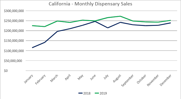 This past December, sales for California’s licensed dispensaries and delivery services reached a combined $251.7 million, increasing four percent from November. Year-over-year sales for the month of December show an increase of five percent, and the total 2019 sales of nearly $3 billion indicate 18 percent growth compared to 2018.