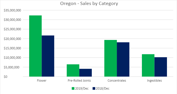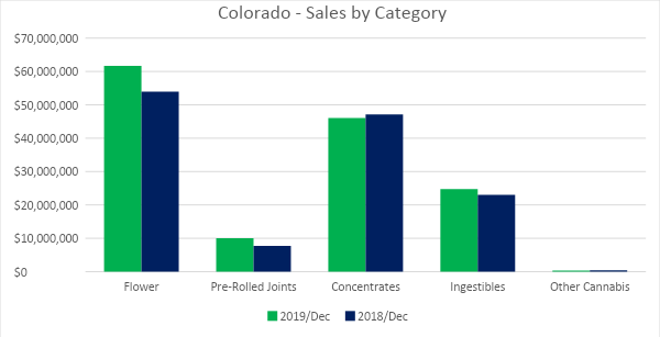 In December, Flower contributed 42 percent towards all revenues with $61.7 million in sales. The category experienced a 14 percent increase in sales compared to December 2018, and a three percent decrease compared to the trailing month. In 2019, sales of Flower increased by nearly 10 percent from 2018. In December, Pre-Rolled Joints sales generated over $10 million, a 31 percent increase compared to December of 2018. At the end of 2019, sales in the pre-rolled joint category reached $106.9 million, a 22 percent increase from 2018.