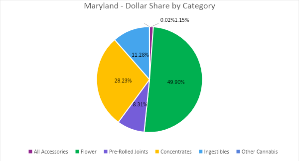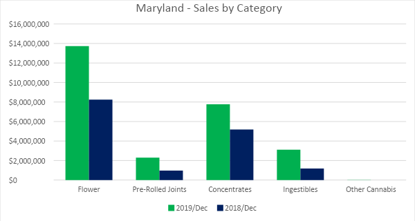 Pre-Rolled Joints remain a small category in Maryland’s medical-only market. Sales of Pre-Rolled Joints were $2.3 million in December and reached $17.3 million in total revenue for 2019. Compared to November 2019, sales for the month increased by nine percent. In the most recent reporting period, the category contributed more than eight percent towards overall revenues for the month.