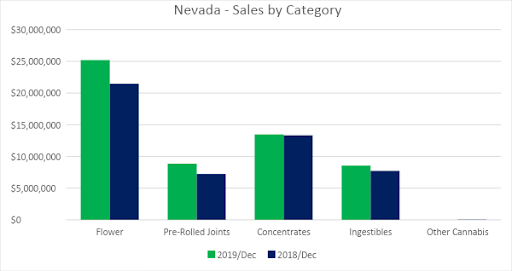 The $8.9 million generated from Pre-Rolled Joints in December 2019 contributed 15 percent towards overall revenues for the month. Nevada is the leading state for the proportion of sales derived from pre-rolls. Compared to December 2018, sales increased by 23 percent. In 2019, pre-rolled joints generated $99.4 million.