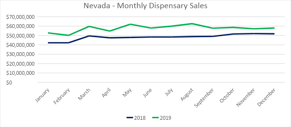 Combined sales for Nevada’s medical and recreational dispensaries totaled at $58 million this past December, a one percent increase from November. Compared to December 2018, sales increased by 12 percent overall. Total revenues for calendar year 2019 were $691.5 million, a 19 percent increase from 2018.