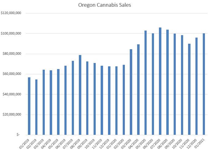 Oregon continues to exhibit astonishingly high growth, with January sales of $100.2 million expanding 48.2% from a year ago, an acceleration from the 42% in December and 32% in November. The market was the only mature market to grow sequentially, gaining 4.4%, Flower sales, at 49%, grew only slightly faster than the market, with concentrates expanding 57.1%.