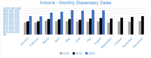 In August 2020, cannabis sales in Arizona’s medical dispensaries reached $92.2 million, declining two percent from July. Compared to the previous August, sales in Arizona grew almost 46 percent. Year-to-date through August, sales have reached $681.4 million, increasing by $223.5 million and 49 percent compared to the same period last year.
