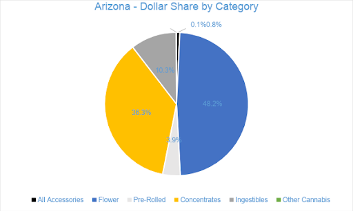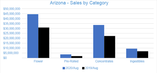 Concentrate sales accounted for more than 36 percent of overall revenues, with sales totaling $33.5 million in August, declining three percent from the trailing month. Vape products, the largest segment of the Concentrates category, generated $20.7 million in sales, accounting for 62 percent of the Arizona Concentrates market and 23 percent of sales across all categories. Compared to August 2019, sales of Dabbable Concentrates grew by 73 percent, while Vape sales grew by 39 percent.
