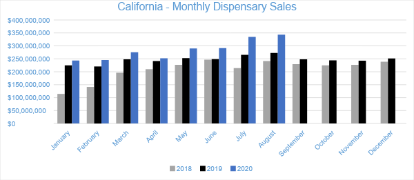 In August 2020, cannabis sales for licensed retailers and delivery services reached $343.6 million, growing three percent from the trailing month and 26 percent compared to August 2019. Year to date, sales in California have reached $2.3 billion, more than a 15 percent increase compared to the same period in 2019.