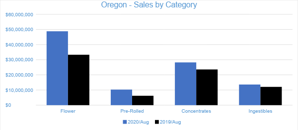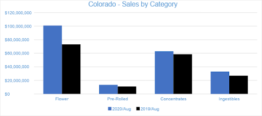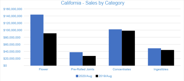 Sales of Flower generated $48.7 million in August 2020, accounting for 47 percent of overall revenues. Compared to the trailing month, Flower sales decreased by three percent, and compared to August 2019, sales increased by 46 percent. Pre-rolled Joints, which are tracked as a separate category, accounted for ten percent of overall revenues, with $10.2 million in sales.