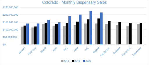 Data provided by BDSA indicates that cannabis sales continued their robust expansion in 5 Western states at a slightly slower pace, with the exception of California. During August, the twelfth month after the onset of the vaping crisis and the sixth month of the pandemic impacting the market, sales across the five markets totaled $838.1 million, down 1% from July, which followed sequential increases of 12% in June, 2% in May and 14% in April. March had spiked to $666.0 million from $579.9 million in February as customers purchased cannabis ahead of store closures and concerns about limitations on access. With the near-term effects of the pandemic now behind us, it’s clear that cannabis demand is surging, even in relatively mature markets, like Oregon and Colorado. Nevada continued to recover as tourism slowly returns, with sales growing 2%. California, which posted 15% sequential growth in July, extended its momentum with a 3% increase, while Colorado contracted 6%. Arizona and Oregon sales pulled back 2%, but both of these states had meteoric growth from a year ago.