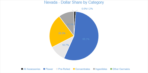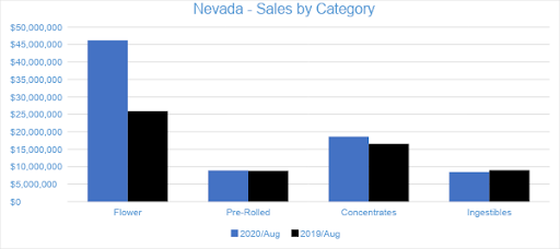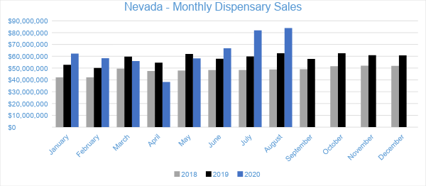 In August, Nevada dispensaries generated $83.9 million in sales, growing 34 percent compared to August of 2019. Compared to the trailing month, sales increased by two percent. Year-to-date through August, sales have reached $505.8 million, growing by ten percent compared to the same period last year.