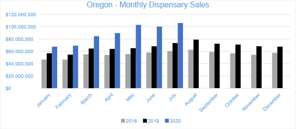 In August 2020, Cannabis sales in Oregon’s medical and adult-use dispensaries reached a combined $104.2 million. Compared to the trailing month, sales in the Oregon market declined by about two percent, and compared to August 2019, sales grew by 32 percent overall. Year-to-date sales in Oregon have reached $724.5 million, growing by 38 percent compared to the same period in 2019.