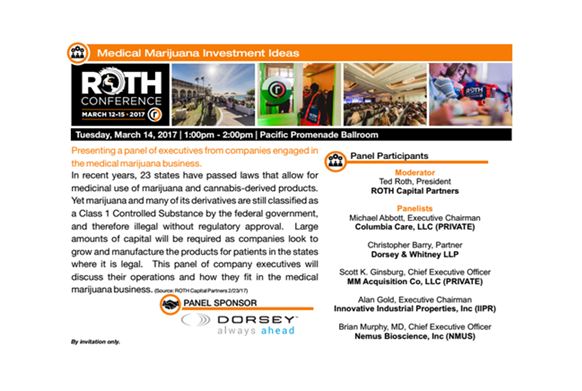 Abbott joined the panel on the 14th, which was moderated by Ted Roth, President of ROTH Capital, and also included Christopher Barry of Dorsey & Whitney, Scott Ginsburg of MM Acquisition Co, LLC, Alan Gold of Innovative Industrial Properties (NYSE: IIPR) and Dr. Brian Murphy of Nemus Bioscience (OTC: NMUS). Each of the panelists gave a brief summary of their company’s involvement in the industry before Roth asked a few questions and then the audience participated.