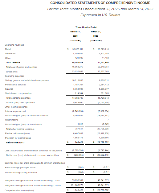 - Retail sales of $35.8M, an increase of 35% compared to $26.5M in Q1 2022