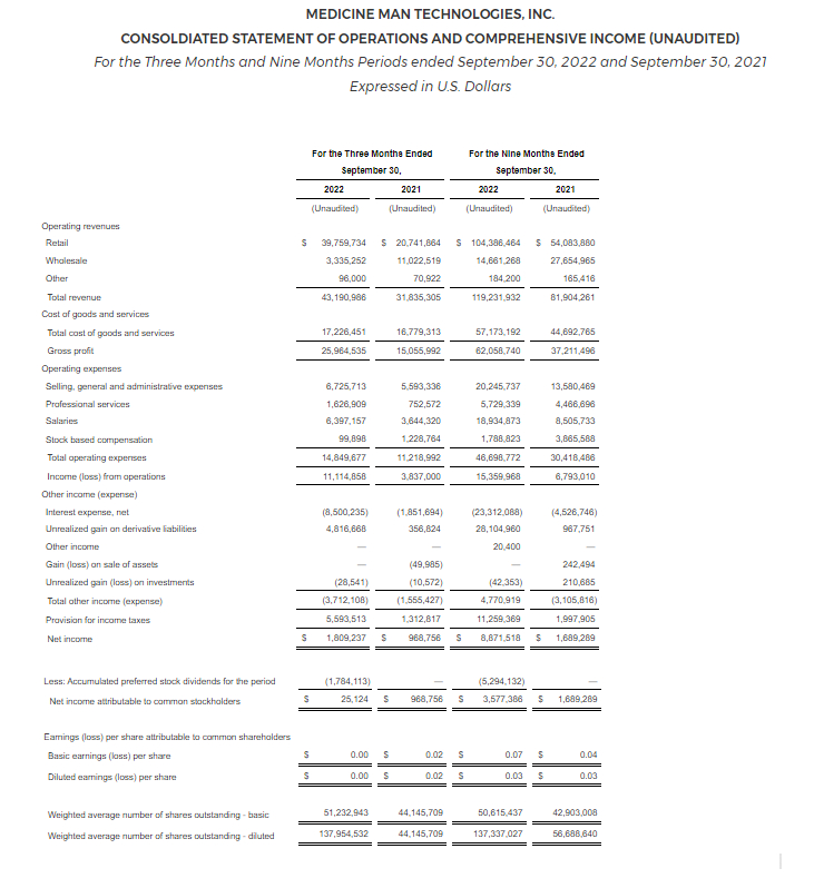 Revenues for the three months ended September 30, 2022 totaled $43,190,986, including (i) retail sales of $39,759,734 (ii) wholesale sales of $3,335,252 and (iii) other operating revenues of $96,000, compared to revenues of $31,835,305, including (i) retail sales of $20,741,864, (ii) wholesale sales of $11,022,519, and (iii) other operating revenues of $70,922 during the three months ended September 30, 2021, representing an increase of $11,355,681 or 36%. The most influential factor driving revenue increases in the third quarter of 2022 as compared to the same period in 2021 is acquisition activity. Revenue for the quarter ended September 30, 2022 included revenue from four consummated acquisitions in Colorado and revenue from the Company’s initial entrance into the New Mexico market with the acquisition of R. Greenleaf, which were not in revenue for the same period in 2021. Revenue from wholesale sales decreased, due in large part to continued pricing pressure in the Colorado wholesale market as a result of supply saturation in flower and bulk distillate products.
