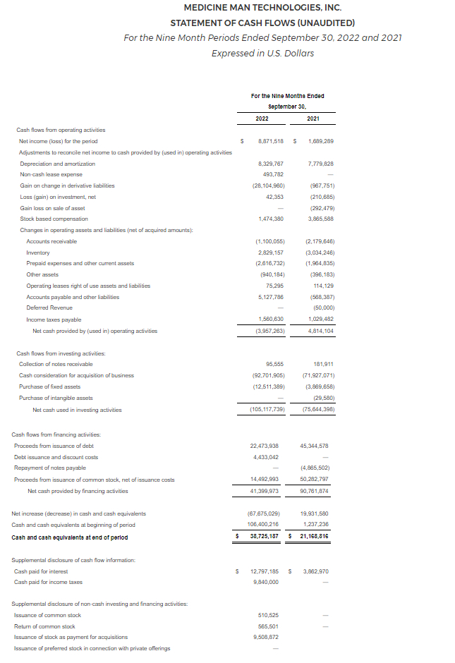 For nine months ending September 30, 2022, the Company used cash for operations of $3,957,263 compared to generating cash of $4,814,104 for the same period in 2021. The Company has cash and cash equivalents of $38.7 million at the end of Q3 2022.