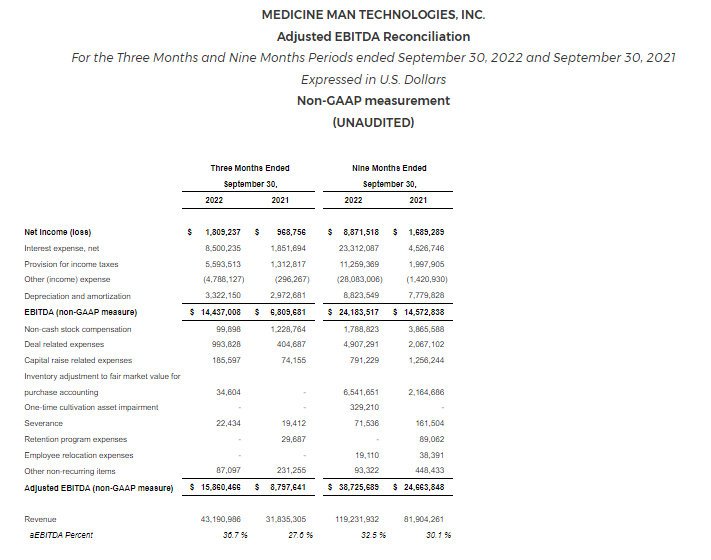 Adjusted EBITDA for Q3 2022 was $15,860,466 representing 36.7% of revenue, compared to $8,797,641 and 27.6% of revenue for the same period last year. This is derived from Operating Income and adjusting one-time expenses, merger and acquisition and capital raising costs, non-cash related compensation costs, and depreciation and amortization. See the financial table for Adjusted EBITDA below adjustment for details.
