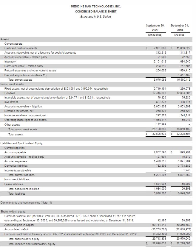 DENVER, November 16, 2020–(BUSINESS WIRE)–Schwazze, formerly operating as Medicine Man Technologies Inc. (OTCQX:SHWZ) (“Schwazze ” or “the Company”), today provided a business update and announced strong financial results for its third quarter ended September 30, 2020.