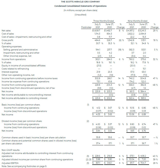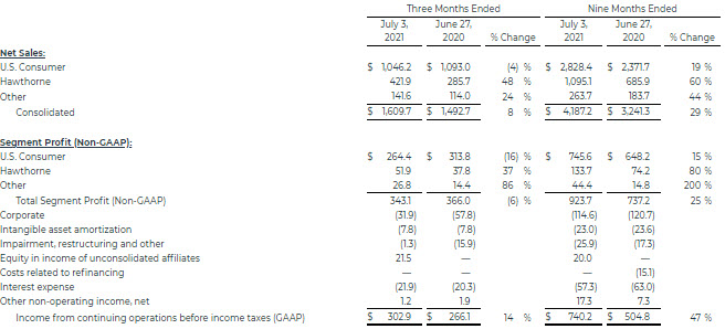 For the period ended July 3, 2021, company-wide sales increased 8 percent to $1.61 billion. U.S. Consumer segment sales declined 4 percent to $1.05 billion from $1.09 billion. Hawthorne segment sales increased 48 percent to $421.9 million compared with $285.7 million. Due to the Company’s fiscal calendar, the third quarter of 2021 began six days later than the third quarter of fiscal 2020, and those six days fell during the peak lawn and garden selling season. The impact of the shift was a decline in sales for the quarter of approximately $115 million on a company-wide basis.
